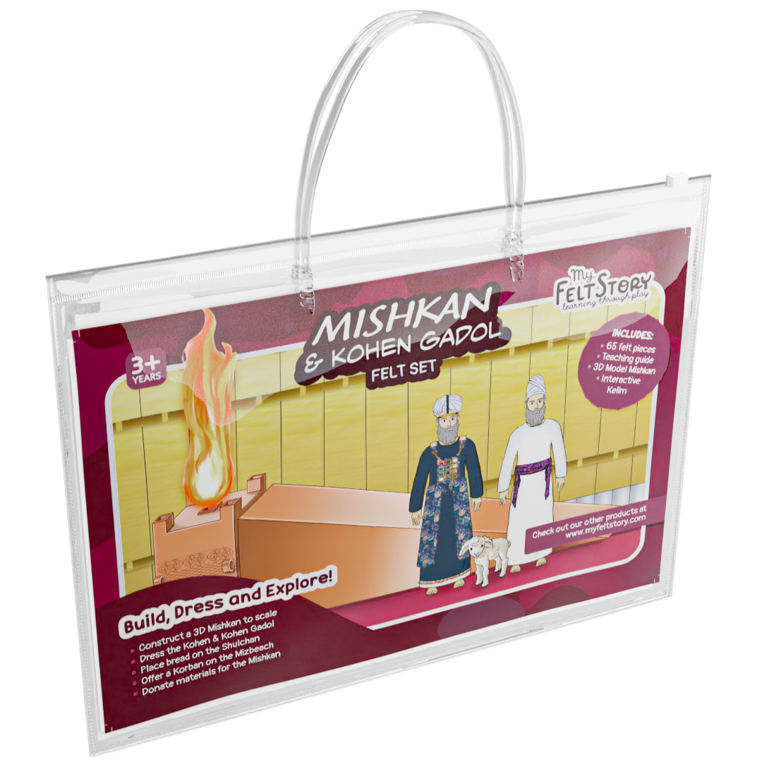 An interactive felt set to build, dress and explore the Mishkan, Keilim and Bigdei Kehuna! High quality felt pieces for you and your children or students to: Build A 3D Mishkan with Keilim! Dress the Kohen and Kohen Gadol. A full set of interactive Keilim: - Add the Lechem Hapanim...